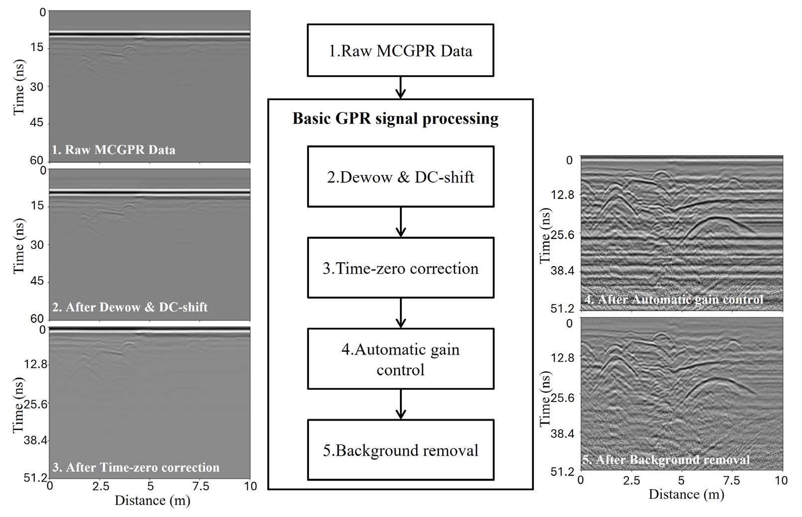 Figure 1. Workflow of basic GPR signal processing for mitigating noise and enhancing the visibility of underground features