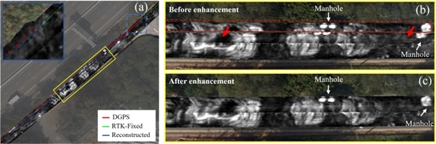 In one urban survey, GNSS signals degraded near tree canopies, causing significant drift and long-distance positioning loss. The proposed method was able to reconstruct the affected trajectories using only the MCGPR data, restoring alignment of high-reflection features such as manholes and dramatically improving the coherence of radar slices (Figure 3). Visual comparisons revealed that objects previously mismatched due to drift were now accurately positioned, validating the method’s ability to overcome the limitations of external positioning systems in complex environments.