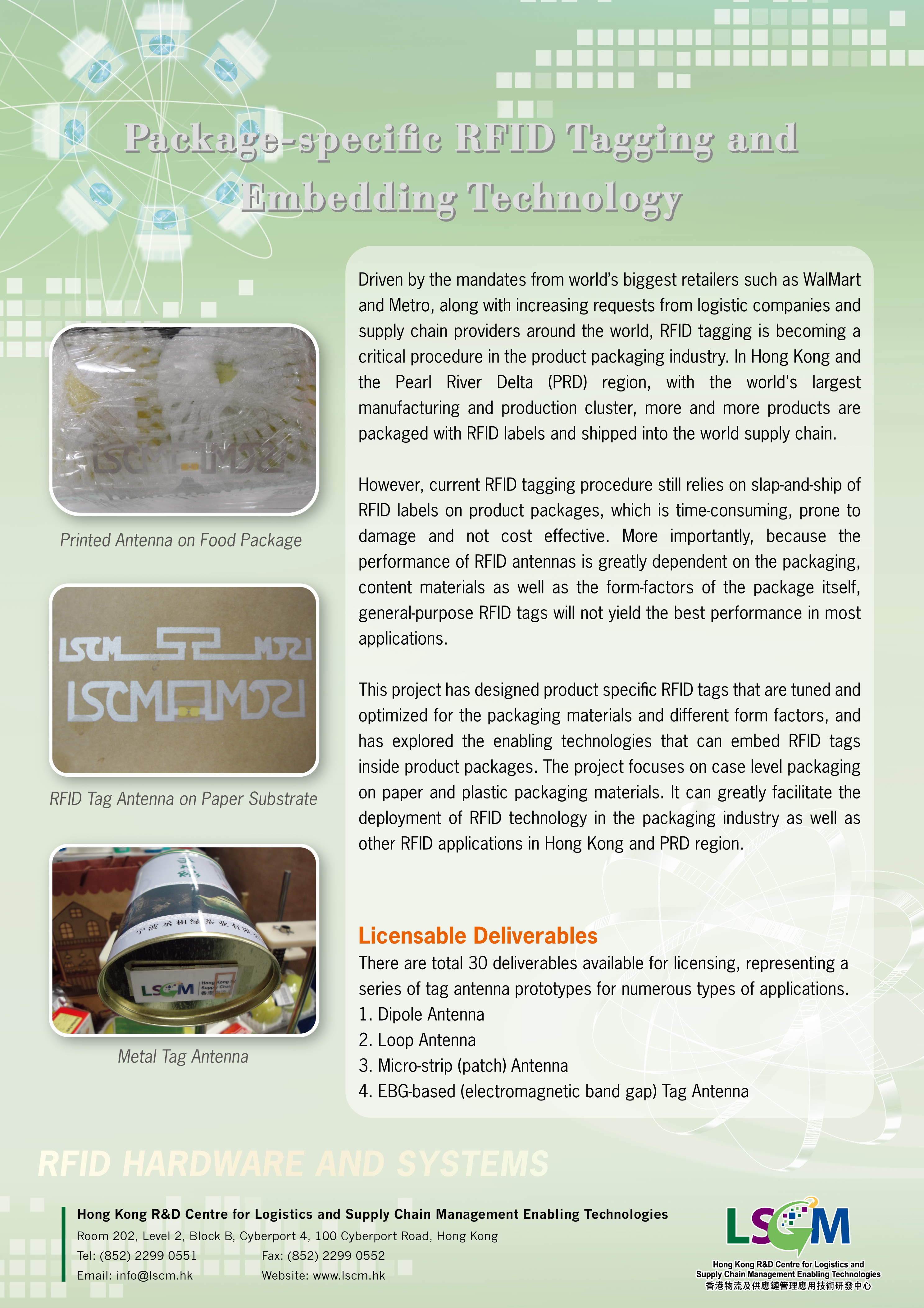 由於全球大型零售商(沃爾瑪、麥德龍等等)的推動,以及物流公司、供應鏈參與者日益增長的要求,RFID貼標已經成為產品包裝行業的一道重要工序。香港和珠三角( PRD )地區擁有世界最大的生產製造產業群,越來越多的產品在包裝上面貼上RFID標籤之後,運送到世界各地。 然而,當前的RFID貼標過程還是直接在產品包裝採用即貼即送的方式,該方式耗時、成本效益低而且標籤容易被損壞。更重要的是,RFID 天線的性能大大地依賴於包裝本身和產品的材料以及包裝的形狀特徵,因此通用的 RFID標籤不會在大多數應用中發揮最好的性能。 在該專案中,我們建議設計特定包裝的RFID標籤,根據包裝材料的特徵與外觀,進行調整和優化,並且研究如何將RFID嵌入產品包裝的基本技術。本專案將專注於以紙及塑膠為包裝原料的包裝箱級別研究。該項目將大大地促進在香港和珠三角地區的包裝行業中部署 RFID技術,同時也必將促進其他RFID應用的發展。